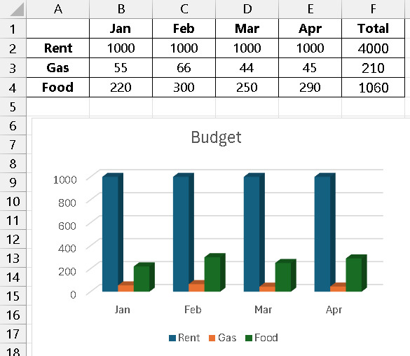 Your chart should now look exactly like the one you uploaded. It will show the total expenses for each month, with the different colors in each column representing the breakdown of costs for rent, gas, and food.